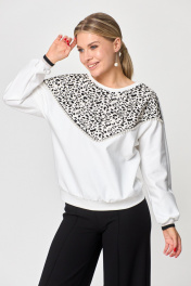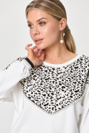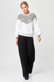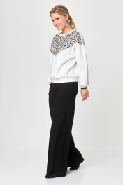 Нарядный трикотажный джемпер белого цвета с отделкой из «леопарда» и черные брюки «палаццо». Джемпер свободного силуэта. Горловина круглая. По переду кокетка из декоративной ажурной ткани «леопард» и жемчужной тесьмой. Рукав длинный цельнокроеный, зауженный к низу, собран на манжетку. По низу джемпера планочка. Длина по спинке 53 см (размер 44-48) Длина по спинке 57 см (размер 50-52) Длина рукава от горловины 70 см. Брюки «палаццо» из струящейся ткани с высокой посадкой на талии, без объема на бедрах и без складок по переду, прямые к низу. Застежка молния по боковому шву. Длина по боковому шву 105 см. Объем по поясу: размер 42-68 см 44-72 см 46-76 см 48-79 см 50-84 см 52-87 см Объем бедер: размер 42-94 см 44-98 см 46-102 см 48-106 см 50-110 см 52-114 см Ширина брюк по низу в сгибе: размер 42- 28 см 44- 30 см 46- 32 см 48- 32 см 50-33 см 52-33 см