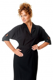 Универсальное деловое платье прямого силуэта с цельнокроеным рукавом «мышь». Горловина с воротником и лацканом на уровне груди. Рукав на манжете, застегивается на петлю и пуговицу. По низу платья невысокие разрезы в боковых швах. Платье без подкладки. Ткань непрозрачная. Съемный пояс с пряжкой подчеркивает талию. Длина размер 52-56 98 см Длина размер 44-50 95 см Длина рукава размер 52-56 47 см (от воротника до низа манжеты) длина рукава размер 44-50 46 см (от воротника до низа манжеты)