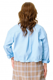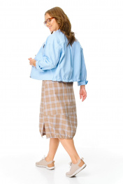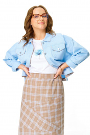 Летний комплект с стиле «спорт-шик» в «английском» цветовом сочетании голубой с бежевым состоит из джинсовой куртки, стильной хлопковой юбки и белой трикотажной футболки с термопечатью по переду. Стильный облегченный укороченный жакет-рубашка из хлопковой комбинированной по цвету ткани свободного силуэта. С воротником, застежка на петли-пуговицы. По переду накладные карманы. По спинке складка от кокетки. Низ свободный, спинка стягивается. Рукав длинный с манжетой. Длина по спинке размер 46-50 54 см Длина по спинке размер 52-54 58 см Длина рукава 51 см и длина плеча 22 см Полуоблегающая футболка из трикотажного полотна с круглой горловиной и коротким рукавом. Длина 56 см размер 50-54 Длина 52 см размер 46-48 Длина рукава 20 см Юбка из плотного хлопка в клетку полуприлегающего силуэта по низу расширена и собрана на «стяжке». Направление клетки «антисимметрия». Застежка по спинке на «потайную» молнию. Пояс притачной с резинкой по бочкам. Карман с боку ниже бедра. С одной стороны разрез. Юбка без подкладки. Длина юбки: 72 см Окружность по талии : размер 46-68-78 см размер 48-72-82 см размер 50-76-86 см размер 52-80-90 см размер 54-84-94 см Объем по бедрам: размер 46-102 см размер 48-106 см размер 50-110 см размер 52-114 см размер 54-116 см