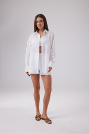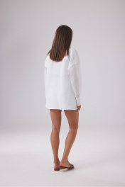 Блузка свободного кроя выполненна из из крапивы в белом цвете. Отложной воротник, центральная застежка на петли и пуговицы. Рукав спущен, по низу рукава манжет. Длина по спинке 75 см, длина рукава от края горловины 78 см.