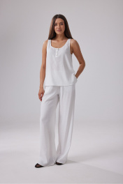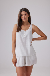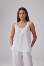 Блузка свободного кроя выполнена из белого полотна с эффектом мятости. Застежка на пуговичках. Длина по спинке 58 см.