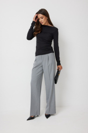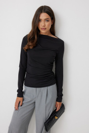 Джемпер женский прилегающего силуэта, выполнен из тонкого трикотажного полотна. По левому боковому шву джемпер присборен. Вырез горловины лодочкой. Рукава длинные, втачные одношовные. Спинка без среднего шва. Длина изделия по спинке 70 см, длина рукава 70 см.