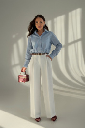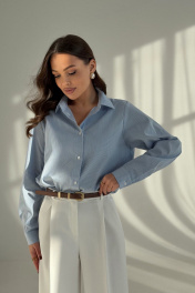 Женская рубашка из хлопковой ткани. Рубашка прямого силуэта. Горловина округлая с классическим рубашечным воротником. Застежка центральная на петли и пуговицы. Рукава длинные, втачные одношовные, снизу с манжетой на пуговице. Спинка прямая без среднего шва. Низ рубашки немного скруглен к боковым швам. Эта рубашка — незаменимая база, которая легко интегрируется в любой повседневный образ.