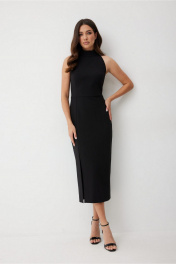 Трикотажное платье которое легко переходит из повседневной жизни в нарядный вечерний образ. Платье прилегающего силуэта, отрезное по линии талии. Выполнено из плотной, хорошо тянущейся трикотажной ткани, которая обеспечивает идеальную посадку по фигуре. Воротник-стойка и американская пройма без рукавов визуально вытягивают силуэт. По переду юбки платья на правой части расположен шов, переходящий в разрез. По спинке застежка на потайную молнию вверху среднего шва. Это платье идеально сочетается с жакетом для работы или яркими аксессуарами для праздника. Промеры в 44 размере: длина по спинке - 123 см длина до талии - 38 см ПОГ - 43 см ПОТ - 35 см ПОБ - 47 см