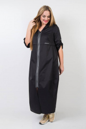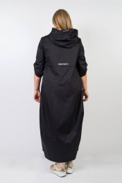Оригинальное платье с капюшоном и эффектной длинной молнией впереди, рукавами регулируемой длины и внутренними карманами в боковых швах имеет значительный объем, но акцентрированные настрочкой лентой и термоапликацией складки выше уровня талии и разрез пол молнией вытягивают силуэт и стройнят фигуру. Длина изделия - 134 см, рукава - 43 см.