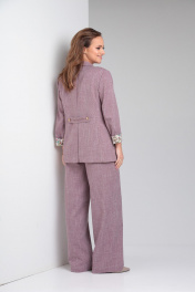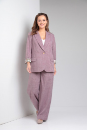 Комплект брючный свободного покроя из однотонной плательно-костюмной ткани. Жакет прямого силуэта. По переду центральная застежка на прорезную петлю и пуговицу, прорезные карманы в рамку с клапанами, край борта по низу округлой формы, нагрудная вытачка выходит от линии кармана. По спинке центральный шов с высоким разрезом от линии талии декорирован хлястиком. На хлястике вышивка на испанском языке «следуй за мечтой». Воротник с лацканом пиджачного типа отложной до линии талии. Рукав втачной. двухшовный, низ обработан широкой обтачкой из отделочной ткани с возможностью отворота. Перед жакета и частично спинка на подкладке из отделочной хлопковой ткани. Брюки длинные прямые свободного покроя. Пояс на резинке. Функциональные карманы в боковом шве. Длина жакета по среднему шву спинки в 46-50р 69 см, в 52-56р 71 см. Ширина изделия на уровне глубины проймы в 46р 52 см, в в 48р 54 см, в 50р 56 см, в 52р 58 см, в 54р 60 см, в 56р 62 см. Длина рукава 57 см Ширина изделия по линии талии в 46р 51 см, в 48р 53 см, в 50 р 55 см, в 52р 57 см, в 54р 59 см, в 56р 61 см. Ширина изделия по линии бедер в 46р 55 см, в 48р 57 см, в 50р 59 см, в 52р 61 см, в 54р 63 см, в 56р 65 см. Ширина по талии в 46р 34 см, в 48р 36 см, в 50р 38 см, в 52р 40 см, в 54р 42 см, в 56р 44 см. Ширина по линии бедер в 46р 51,5 см, в 48р 53,5 см, в 50р 55,5 см, в 52р 60 см, в 54р 62 см, в 56р 64 см.