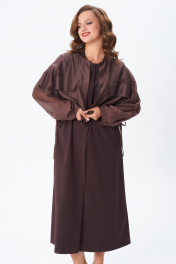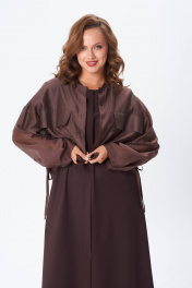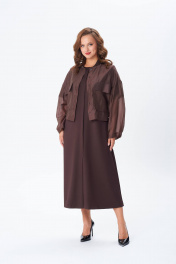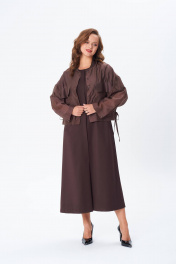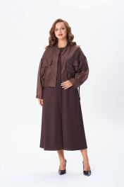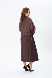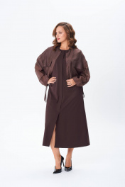 Комплект женский состоит из платья трапециевидного силуэта и бомбера свободного покроя. По переду платья нагрудные вытачки от бокового шва. По центру складка, имитирующая потайную застежку, которая заканчивается шлицей. По спинке средний шов с потайной застежкой на молнию. Рукав втачной короткий. Горловина округлой формы обработана обтачкой. Бомбер по переду с центральной застежкой на петли и пуговицы, накладной карман с клапаном, по низу кармана кулиса. По спинке кулиса в нижней части. Рукав втачной на спущеной пройме, по низу декоративная складка с застежкой на петлю и пуговицу. По горловине стойка. Состав платья: вискоза 32%, полиэстер 65%, спандекс 3%. Состав бомбера: лиоцелл 85%, полиэстер 15%. Длина платья по спинке во всех размерах 120 см. Ширина изделия на уровне глубины проймы в 48р 54 см, в 50р 56 см, в 52р 58 см, в 54р 60 см, в 56р 62 см, в 58р 64 см, в 60р 66 см, в 62р 68 см, в 64р 70 см. Длина рукава 27 см. Ширина изделия по линии талии в 48р 51 см, в 50р 53 см, в 52р 55 см, в 54р 57 см, в 56р 59 см, в 58р 61 см, в 60р 63 см, в 62р 65 см, в 64р 67 см. Ширина изделия на уровне линии бедер в 48р 57 см, в 50р 59 см, в 52р 61 см, в 54р 63 см, в 56р 65 см, в 58р 67 см, в 60р 69 см, в 62р 71 см, в 64р 73 см. Ширина рукава вверху в 48р 19,5 см, в 50р 20,5 см, в 52р 21,5 см, в 54р 22,5 см, в 56р 23,5 см, в 58р 24,5 см, в 60р 25,5 см, в 62р 26,5 см, в 64р 27,5 см. Длина бомбера по спинке в 48-52р 48 см, в 54-64р 51 см. Ширина изделия на уровне глубины проймы в 48р 56 см, в 50р 57 см, в 52р 58 см, в 54р 59 см, в 56р 60 см, в 58р 61 см, в 60р 62 см, в 62р 63 см, в 64р 64 см. Ширина изделия по линии низа в 48р 56 см, в 50р 57 см, в 52р 58 см, в 54р 59 см, в 56р 60 см, в 58р 61 см, в 60р 62 см, в 62р 63 см, в 64р 64 см. Длина рукава 46 см.