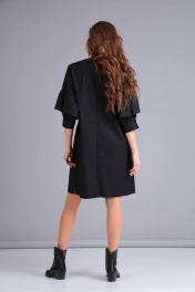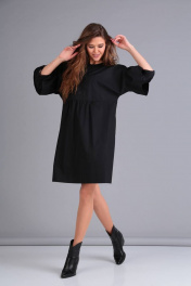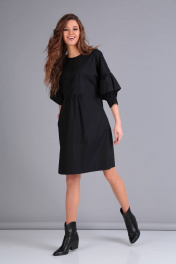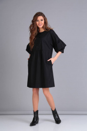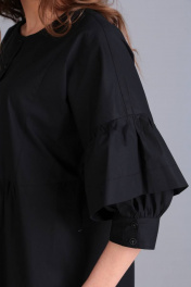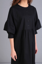 Платье женское свободного кроя со спущенным рукавом из хлопковой ткани. По переду завышенная отрезная линия талии; вертикальные рельефы, центральная застёжка на петли-пуговицы; по юбке сборка между рельефами. По спинке средний шов. В боковых швах: карманы; по низу разрезы+широкая подгибка. Рукав двойной: нижняя часть со сборкой на манжете, верхняя часть в виде волана на сборку. Горловина округлой формы, обработана обтачкой. Обтачки и нижний манжет – из отделочной ткани. Длина рукава – 54 см Длина изделия – 94 см
