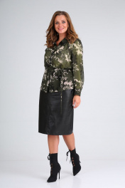 Юбка прямая из экокожи; на притачном поясе с застёжкой на петлю-пуговицу; на подкладке. По переду рельефные швы по горизонтали и вертикальный по центру. По заднему полотнищу средний шов с тесьмой-молнией в нём; шлица. Длина изделия: юбка – 62 см