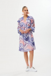 Женственное весеннее платье в нежных оттенках сирени и розы не оставит равнодушной ни одну представительницу прекрасного пола. Модель украшена лаконичными рюшами спереди и сзади. Рукав в 3/4 идеально подходит для весенней погоды. Платье можно надеть на прогулку, встречу с друзьями или вечеринку.