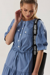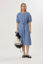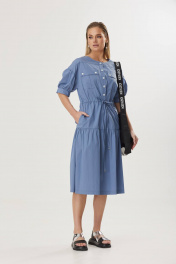 Платье А-силуэта, длиной миди. Рукав со сборкой, обработан манжетой, длиной до линии локтя. По центру переда приточная планка, застегивающаяся на петли и пуговицы. По линии талии-кулиса. В боковых швах-карманы, по низу платья разрезы.