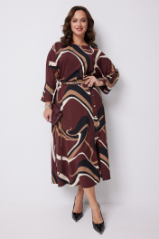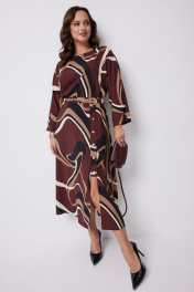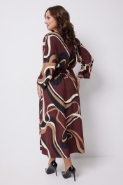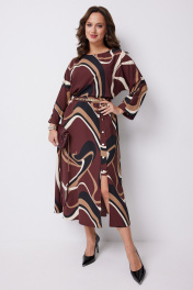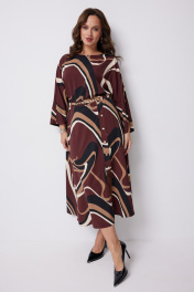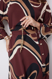 Стильное платье А-силуэта, выполненное из вискозы с оригинальным принтом. Платье отрезное по линии талии. Верхняя часть переда платья с круглой горловиной, спинка - со средним швом и капелькой, застегивающейся на навесную петлю и пуговицу. Рукав цельнокроенный, длиной 7/8. Нижняя часть платья покроя полусолнце. На одной из сторон юбки переда обработана отделочная планка с декоративными пуговицами, внизу - разрез. В боковых швах в области бедер обработаны карманы. В центральной части переда в области талии - притачной пояс со съемной декоративной цепью, которая изящно подчеркивает линию талии. По боковым швам и спинке пояса вставлена широкая резинка. Это нарядное женское платье идеально подходит для торжественных мероприятий, романтических прогулок, новогодних корпоративов и юбилеев, подчеркивает индивидуальность и стиль.