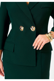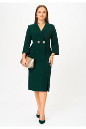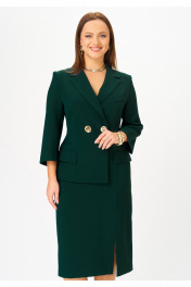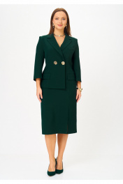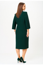 Платье прилегающего силуэта, длиной миди, выполненное из плательной поливискозы. Платье жакетного типа с ассиметричным передом. Одна из сторон переда имитирует жакет и юбку, другая-платье. Перед с талиевыми вытачками с подрезом. В области груди настрочена декоративная листочка, в области бедер - карманы-обманки с листочками и клапаном. По переду обработан разрез. В области талии расположена застёжка на 2 петли и крупные декоративные пуговицы. Спинка со средним швом, в который вставлена потайная молния. Рукав 2-х шовный втачной, длиной 3/4. В 46 размере ширина по груди - 47 см, по талии - 43 см, по бедрам - 50 см. В 48 размере ширина по груди - 49 см, по талии - 45 см, по бедрам - 52 см, длина - 114 см. В 52 размере ширина по груди - 53 см, по талии - 50 см, по бедрам - 55 см. В 56 размере ширина по груди - 57 см, по талии - 54 см, по бедрам - 59 см.