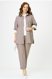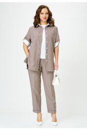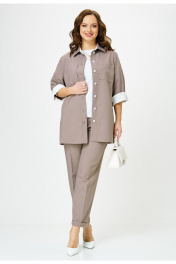 Комплект женский 3-х предметный, состоящий из блузы, брюк и футболки. Блуза и брюки выполнены из поливискозы. Блуза прямого силуэта, с центральной застежкой на петли-пуговицы. Горловина оформлена воротником рубашечного типа. Рукава одношовные длиной 3/4, с возможностью подворота длины. Перед с нагрудными вытачками, в области груди расположены накладные карманы. Спинка с декоративной кокеткой. По боковым швам блузы - разрезы. Отделочные элементы из контрастной ткани, а также контрастные пуговицы добавляют оригинальность данной модели. Брюки классической формы, слегка заужены к низу, со стрелками. Пояс с резинкой. От боковых швов вставлен шнур с декоративными наконечниками. По центру переда обработана застежка- обманка. В боковых швах расположены наклонные карманы. По низу брюк - цельнокроенная манжета. Футболка прямого силуэта с втачным коротким рукавом.