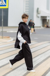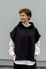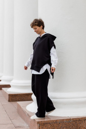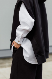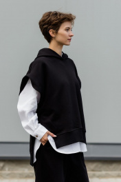 Комплект суперстильной дизайнерской жилетки с капюшоном черного цвета из премиального турецкого хлопка с белой рубашкой из умягченного льна закрывает все базовые потребности - уместно на работе, стильно в кафе, удобно на прогулке. Уникальная выкройка обеспечивает идеальную посадку обладательницам размеров от 42 до 52 (ростом от 160 до 180 см). Ширина Жилетки 65 см, высокие боковые разрезы идеально повторяют разрезы рубашки. Длина передней планки 65 см, спинки 72 см. Двухсторонний капюшон красиво выкладывается вокруг горловины и, надетый на голову, не тянет, а красиво обрамляет лицо. Рубашка белая из умягченного льна 44-46: Длина передней планки рубашки 69 см, длина изделия по спинке 75 см. длина рукава от воротника 73 см. Полуобхват в области груди 58 см. Рубашка белая из умягченного льна4 8-50: Длина передней планки рубашки 72 см, длина изделия по спинке 78 см. длина рукава от воротника 75 см. Полуобхват в области груди 61 см. Абсолютно универсальный комплект для любого гардероба и стиля. Уход за изделием: деликатная стирка с жидким моющим средством при температуре 30-40 градусов.