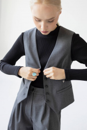 Женский классический жилет из костюмной ткани прилегающего силуэта, чуть ниже линии талии, застегивается центрально на пуговицы. Жилет офисный имеет V-образный вырез. По переду на линии талии выполнены прорезные карманы в рамку с одной обтачкой. Низ изделия фигурный с заострёнными углами.