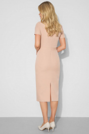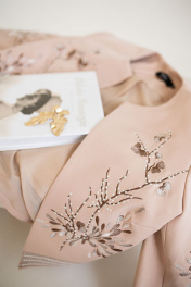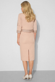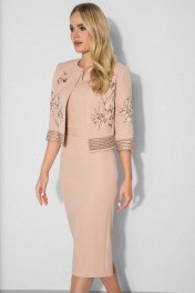 Этот изящный комплект с вышивкой, способен кардинально преобразить любую женщину, создав чувственный и очень женственный образ. Костюм женский из костюмно-плательной ткани, состоит из платья-футляр полуприлегающего силуэта с коротким рукавом и жакета полуприлегающего силуэта без застежки с художественной вышивкой. Жакет женский полуприлегающего силуэта с вышивкой по переду и в нижней части спинки. Жакет на подкладке с плечевыми накладками, без застежки. По переду жакета стачаны нагрудные вытачки, выходящие из бокового шва. Спинка жакета отрезная по линии талии с талиевыми вытачками, выходящими из горизонтального подреза, средним швом идущим то подреза до горловины и наклонными вытачками, выходящими из горловины спинки. Горловина круглой формы, обтачная без воротника. Линия борта прямая. Рукава втачные двухшовные, длиной ¾ с вышивкой по низу и центру рукава. Платье женское полуприлегающего силуэта на трикотажной подкладке отлетной по низу, отрезное по линии талии с притачным поясом по переду и спинке. Переднее полотнище платья в верхней части с рельефными швами, выходящие из проймы до линии талии и средним швом, в котором обработан разрез. В нижней части переда стачаны талиевые вытачки. Спинка платья в верхней части с рельефными швами, выходящими из проймы и идущими до притачного пояса, в нижней части спинки платья стачаны талиевые вытачки. Спинка платья со средним швом, в котором обработана застежка на потайную тесьму-молнию. В нижней части среднего шва обработан разрез отсроченный на 0,5 см от края. Горловина фигурной формы, обтачная. Рукава втачные одношовные, короткие. Длина жакета по среднему шву спинки - 47,0 см (±2,0 см), длина рукава - 43,0 см (±2,0 см), длина платья по среднему шву спинки - 112,0 см (±2,0 см), длина рукава - 20,0 см (±1,0 см) полиэстер 71%, вискоза 26%, спандекс 3% (костюмно-плательная)