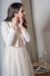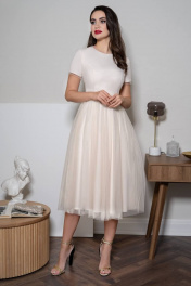 Костюм женский нарядный двухпредметный, состоит из приталенного платья силуэта песочные часы и укороченного жакета. Жакет женский укороченный, длиной чуть ниже линии талии, из костюмно-плательной ткани в стиле Chanel, полуприлегающего силуэта, на подкладке, однобортный, без воротника с центральной бортовой застежкой встык на 4 потайных пришивных крючка. Перед с талиевой вытачкой, идущей от низа изделия до центра груди. Спинка со средним швом и рельефами, выходящими из проймы. Рукава втачные двухшовные, длинные. Горловина круглой формы обтачная. Плечевой пояс оформлен плечевыми накладками. Платье женское многослойное, с притачной по горловине и низу рукава узкой отделочной деталью из сетки, силуэта песочные часы, отрезное по линии талии, длиной миди. Верхний слой платья из отделочного материала - сетка, нижний слой - легкая плательная ткань. Верхняя часть переда и спинки (лиф) с рельефами, выходящими из проймы и идущими до линии талии. Нижняя часть платья (юбка) многослойная, расклешенная книзу. Верхний слой юбки состоит из двух слоев сетки. В шве притачивания юбки к лифу - сборка. Спинка платья со средним швом, в котором обработана застежка на потайную тесьму-молнию. Рукава втачные одношовные, короткие. Горловина круглой формы обтачная.