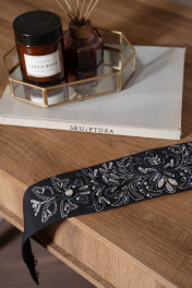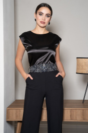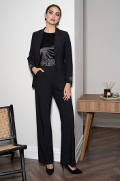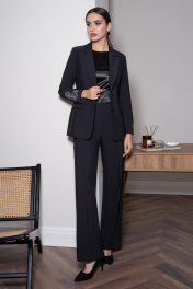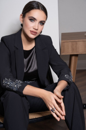 Этот изысканный брючный костюм – воплощение элегантности, загадочности и безупречного вкуса. Лаконичный силуэт, строгие линии и идеальная посадка подчёркивают утончённость образа. Особый акцент в костюме сделан на вышивке – изящный цветочный узор на поясе и манжетах жакета создаёт роскошный контраст, добавляя нотку утончённого блеска. Атласный топ с лёгким переливом гармонично дополняет образ, придавая ему мягкость и женственность. Костюм женский трёхпредметный состоит из удлиненного жакета полуприлегающего силуэта с вышивкой на рукаве, брюк и блузы. В комплект к брюкам идет съемный пояс с вышивкой расшитой декоративными камнями. Жакет женский из костюмно-плательной ткани, удлиненный, полуприлегающего силуэта, на подкладке, с центральной бортовой застежкой на 2 петли и пуговицы. По переду жакет с талиевой вытачкой, выходящей из горизонтального подреза расположенного чуть ниже линии талии, в котором обработан прорезной карман "в рамку" с клапаном. Один угол клапана - закругленный, другой заостренный - идет на продолжение бокового шва. В верхней части переда на левой половинке настрочена листочка, несет декоративную функцию. Спинка с рельефными швами, выходящими из проймы до низа и средним швом. Горловина обработана отложным воротником пиджачного типа. Углы лацкана заостренной формы. Линия борта внизу закругленная. Рукава втачные двухшовные, длинные, с декоративной вышивкой в нижней части. Внизу локтевой шов завершается маленькой шлицей. Жакет с плечевой накладкой. Брюки женские из костюмно-плательной ткани «со стрелками» прямые от колена, длинные с завышенной линией талии, без пояса, на обтачке. В верхней части передних половинок брюк застрочены 2 пары складок. Одна складка является продолжением «стрелки». На задних половинках брюк стачаны 2 пары талиевых вытачек. В боковых швах обработаны карманы с наклонной линией входа. В верхней части брюк по среднему и боковым швам настрочены шлевки для пояса. Верхний край брюк обработан обтачкой. Спереди обработана застежка на тесьму-молнию с гульфиком и откоском. В комплект к брюками идет съемный пояс, застегивающийся на 2 пришивных брючных крючка. Блуза женская из блузочной ткани со спущенной линией плеча, без рукавов, свободного кроя, полуприлегающего силуэта. Перед простой, спинка со средним швом, в верхней части обработан разрез, застегивающийся на 1 навесную петлю и пуговицу. Горловина окантована, по краю проложена отделочная строчка, ширина шва 0,6 см. По краю проймы и разрезу проложена отделочная строчка - 0,2 см. По низу блузки широкая подгибка. Внимание!!! размер и цвет фурнитуры может незначительно отличаться от фото. "44 размер ЖАКЕТ: длина жакета по среднему шву спинки – 69,0 см (±2,0 см), ширина жакета на уровне глубины проймы – 49,0 см (±1,0 см), ширина жакета на уровне линии талии – 42,0 см (±1,0 см), ширина жакета по низу – 52,0 см (±1,0 см), длина рукава жакета – 61,0 см (±1,0 см), ширина рукава жакета вверху – 17,0 см (±1,0 см), ширина рукава внизу - 12,0 см (±0,5 см), длина плеча жакета – 11,5 см (±0,5 см). БЛУЗА: длина блузы по середине спины – 65,5 см (±2,0 см), ширина блузы на уровне глубины проймы – 46,5 см (±1,0 см), ширина блузы на уровне линии талии – 44,0 см (±1,0 см), ширина блузы по низу – 49,5 см (±1,0 см), длина плеча блузы – 13,5 см (±0,5 см). БРЮКИ: длина брюк с поясом – 113,0 см (±2,0 см), ширина брюк на уровне линии талии – 35