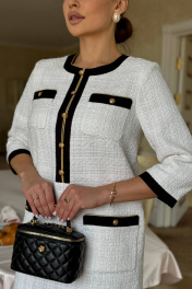 Иметь в гардеробе платье в стиле Шанель обязана каждая женщина. Такая модель олицетворяет собой элегантность, изысканность, шарм. Красота этого платья выражена в простых линиях, неповторимой женственности. С платьем в стиле Шанель удастся создать элегантный образ, подчёркивающий индивидуальность. Платье женское из костюмно-плательной ткани (твид), прямого силуэта, на подкладке притачной по низу. Низ изделия с разрезами по боковым швам и отрезной контрастной деталью. Перед платья с нагрудной вытачкой, выходящей из бокового шва, с двумя парами накладных карманов, с закругленными углами. С центральной планкой от линии талии до верху с 5 декоративными пуговицами (размер и цвет фурнитуры может незначительно отличаться от фото). Нагрудные карманы по размеру немного меньше, чем нижние. Нижний карман расположен на уровне линии бедра. Верхний край карманов с планками из отделочной ткани и пуговицей. По середине центральной планки, горловине и верхнему срезу карманов - втачной кант. Спинка со средним швом в котором обработана застежка на потайную тесьму-молнию. Рукава втачные двухшовные, длиной ¾ с замкнутой манжетой контрастного цвета.Горловина овальной формы, обтачная. Длина платья по среднему шву спинки – 90,0 см (±2,0 см), Длина рукава – 45см (±1,0 см). Тип ткани: костюмно-плательная. Состав: полиэстер 54%, хлопок - 34%, вискоза 12%.