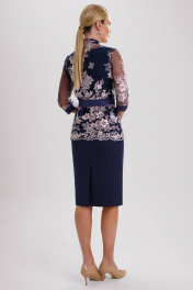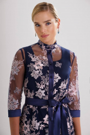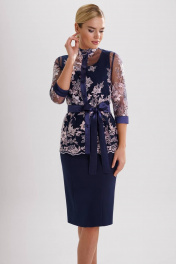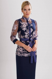 Стильный нарядный комплект с фактурным кружевом – прекрасный выбор для торжественного случая. Костюм женский комбинированный, состоит из блузы полуприлегающего силуэта из гипюра и платья полуприлегающего силуэта из костюмно-плательной ткани. Блузка женская из гипюра с центральной застежкой на 6 петель и пуговиц расположенных на притачной планке из отделочной ткани (атлас). Перед блузки с нагрудной вытачкой, выходящей из бокового шва. Спинка с талиевыми вытачками и средним швом. Рукава втачные одношовные с притачной замкнутой манжетой из отделочного материала, длиной ¾. Горловина обработана воротником-стойкой. Блуза завязывается съемным поясом из отделочной ткани (атлас). Платье женское длиной за колено, без рукавов. Перед с рельефными швами, выходящими из проймы до низа. Спинка с талиевыми вытачками и средним швом, в котором обработана застежка на потайную тесьму-молнию. В нижней части среднего шва спинки обработана шлица. Горловина круглой формы, обтачная.