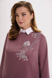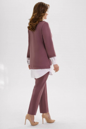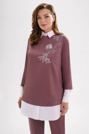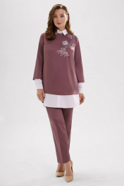 Брючный костюм, дополненный изящной вышивкой, является очень стильным и модным предметом одежды. Он прекрасно вписывается в самые разные композиции и позволяет выглядеть очень привлекательно. Костюм женский трехпредметный, состоит из блузы с вышивкой, удлиненной блузки и брюк. Блуза женская из костюмно-плательной ткани прямого силуэта с декоративной вышивкой расположенной в верхней левой части переда и асимметричной линией низа, спинка длиннее чем перед. Перед блузы с нагрудной вытачкой, выходящей из проймы. Спинка простая. По боковым швам обработаны разрезы. По низу блузы проложена отделочная строчка. Рукава втачные одношовные, длиной ⅞. По низу рукава проложена отделочная строчка. Горловина формы “лодочка”, обтачная. Брюки женские из костюмно-плательной ткани зауженные к низу со стрелками, длинные. На задних половинках брюк стачаны талиевые вытачки. В боковых швах обработаны карманы с наклонной линией входа. Верхний край брюк обработан притачным поясом с резинкой по спине, для лучшего прилегания к талии. Пояс застегивается на 1 петлю и пуговицу. Спереди обработана застежка на тесьму-молнию с гульфиком и откоском. Блузка женская из блузочной ткани, удлиненная, с супатной (потайной) застежкой на 8 петель и пуговиц (размер и цвет фурнитуры может незначительно отличаться от фото), расположенных на цельнокроёной планке. Перед с нагрудными вытачками, выходящими из бокового шва. Спинка с отрезной кокеткой и средним швом. Рукава втачные одношовные длинные. Низ рукава с разрезом и притачной манжетой со скошенными концами, застегивающимися на петлю и пуговицу. Воротник рубашечного типа с отрезной стойкой, застегивается на 1 петлю и пуговицу. Низ блузки фигурной формы. По низу прострочена отделочная строчка. Длина блузы по середине спинки - 71,0 см (±3,0 см), Длина рукава блузы - 53,0 см (±1,5 см). Длина брюк по боковому шву с поясом - 102,0 см (±3,0 см). Длина рубашки по середине спинки - 81,0 см (±3,0 см), Длина рукава рубашки - 61,0 см (±1,5 см). Тип ткани на блузу и брюки: костюмно-плательная. Состав блузы и брюк: полиэстер - 64%, вискоза - 33%, эластан - 3%. Тип ткани на блузку: блузочная. Состав блузки: хлопок - 76%, полиэстер - 22%, эластан - 2%.
