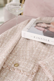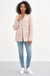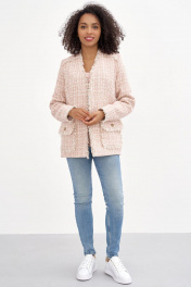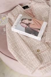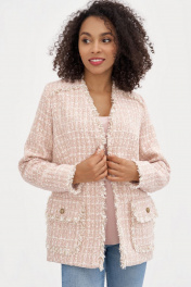 Жакет в стиле Шанель – незаменимая вещь женского гардероба, поскольку, данная модель одежды весьма удачно дополняет образы разного стиля. Эта модель универсальная, она подойдет любой женщине, независимо от её возраста, предпочитаемого стиля одежды и телосложения. Жакет женский полуприлегающего силуэта из костюмно-плательной ткани типа Chanel с центральной бортовой застежкой встык на 4 пришивных крючка, с отделочным элементом по борту и горловине - бахрома (из основной ткани). Жакет на подкладке с плечевыми накладками. По переду жакет с рельефными швами, выходящими из проймы и талиевыми вытачками, идущими от низа изделия до центра груди. В верхней части переда притачная кокетка с бахромой в шве. В нижней части переда два накладных кармана с клапаном, оформленные бахромой. Карман застегивается на 1 петлю и пуговицу (размер и цвет фурнитуры может незначительно отличаться от фото). Углы клапана и кармана скругленные. Спинка с рельефными швами, выходящими из проймы до низа и средним швом. Горловина V-образной формы, обтачная. Линия борта прямая. Рукава втачные двухшовные, длинные с бахромой по низу. Длина жакета по среднему шву спинки - 68,0 см (±3,0 см), Длина рукава - 63,0 см (±2,0 см). Состав ткани: акрил – 36%, полиэстер – 33%, вискоза - 23%, люрекс – 8%