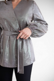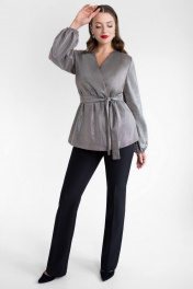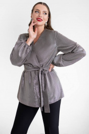 Эффектная блузка — прекрасный вариант для торжественного мероприятия. Крой блузки позволяет всегда выглядеть стильно и отлично скрывает недостатки фигуры. Модель будет отлично сочетается с другими предметами вашего гардероба. Блузка женская прямого силуэта, на трикотажной подкладке. Блуза на запáх, с завязкой с левой стороны переда, с правой застегивается на 1 пришивную кнопку. Перед блузки без нагрудных вытачек . Спинка без среднего шва. Рукава втачные одношовные, низ рукавов на резинке. Горловина V- формы, обтачная. Средняя длина блузки по среднему шву спинки – 70,0 см (±2,0 см), Длина рукава блузки– 62,0 см (±1,0 см). Тип ткани: трикотажное полотно. Состав: полиэстер - 83%, люрекс - 12%, спандекс - 5%.