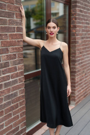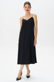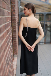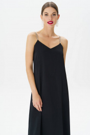Это черное платье с бретельками, украшенными стразами, станет идеальным выбором для создания изысканного и элегантного образа. Фасон подчеркнет вашу фигуру, а открытые плечи придадут образу женственности и загадочности.В этом великолепном наряде вы непременно окажетесь в центре внимания и будете выглядеть стильно и безупречно. Платье женское, нарядное на бретелях из металлической цепи с камнями (фурнитура может незначительно отличаться от фото), полуприлегающего силуэта, расширенное к низу. Платье на подкладке. Платье выполнено из струящейся ткани длиной миди. Перед платья с нагрудными вытачками, идущими от бокового шва. Верх платья обтачной. В боковых швах обработаны карманы. Средняя длина платья по середине спинки - 92,5 см (±3,0 см), Средняя длина платья по боковому шву - 94,5 см (±3,0 см), Длина бретели (цепочки) - 34,0 см (±3,0 см). Тип ткани: плательно-блузочная Состав: полиэстер - 95%, спандекс - 5%. Состав подкладки: полиэстер - 91%, спандекс - 9%. Внимание!!! Вещи расшитые камнями и бусинами рекомендуется стирать вручную. В качестве стирального порошка лучше использовать жидкие стиральные средства. Нежелательно использовать ополаскиватель для белья, так как украшения могут поменять цвет и потускнеть. Гладить через ткань.