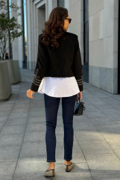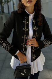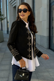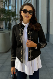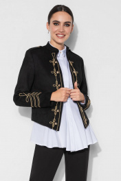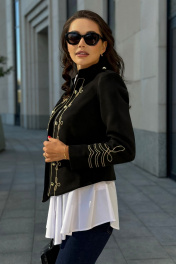 Замшевый жакет в стиле милитари с вышивкой - это оригинальный и стильный элемент гардероба, который подчеркнет вашу индивидуальность. Вышивка на жакете добавляет ему уникальности и делает его неповторимым. Этот жакет идеально сочетается с джинсами, брюками, платьями, создавая образ, который будет привлекать внимание окружающих. Жакет женский полуприлегающего силуэта из мягкой искусственной замши на трикотажной основе в гусарском стиле с декоративной вышивкой шнуром и шестью пуговицами, расположенными параллельно вышивке вдоль борта на левой и правой половинке, без застежки, на подкладке, с погонами, закрепленными пуговицей. Перед жакета разрезной, с нагрудными вытачками, выходящими из бокового шва. Спинка с рельефами, выходящими из проймы и средним швом. Линия низа асимметричная, спинка короче переда. По низу центральная часть переда выполнена углом. Рукава втачные двухшовные, длинные, с декоративной вышивкой шнуром в нижней части. Горловина обработана воротником-стойкой. Жакет с плечевыми накладками. Средняя длина жакета по среднему шву спинки - 50,0 см (±3,0 см), средняя длина рукава – 61,0 см (±1,5 см). Тип ткани: костюмно-плательная. Состав изделия: полиэстер - 75%, вискоза - 21%, спандекс - 4% "44:Длина жакета по среднему шву спинки – 49,5 см (±1,5 см), Ширина на уровне глубины проймы – 49,5 см (±1,0 см), Ширина на уровне линии талии – 45,0 см (±1,0 см), Длина рукава – 60,6 см (±1,0 см), Ширина рукава жакета вверху – 17,0 см (±1,0 см), Ширина рукава внизу - 12,4 см (±0,5 см), Длина плеча – 12,3 см (±0,5 см). 46:Длина жакета по среднему шву спинки – 49,5 см (±1,5 см), Ширина на уровне глубины проймы – 51,5 см (±1,0 см), Ширина на уровне линии талии – 47,0 см (±1,0 см), Длина рукава – 60,6 см (±1,0 см), Ширина рукава жакета вверху – 18,0 см (±1,0 см), Ширина рукава внизу - 12,4 см (±0,5 см), Длина плеча – 12,3 см (±0,5 см). 48:Длина жакета по среднему шву спинки – 49,5 см (±1,5 см), Ширина на уровне глубины проймы – 53,5 см (±1,0 см), Ширина на уровне линии талии – 49,0 см (±1,0 см), Длина рукава – 60,6 см (±1,0 см), Ширина рукава жакета вверху – 19,0 см (±1,0 см), Ширина рукава внизу - 12,4 см (±0,5 см), Длина плеча – 12,3 см (±0,5 см). 50:Длина жакета по среднему шву спинки – 49,5 см (±1,5 см), Ширина на уровне глубины проймы – 55,0 см (±1,0 см), Ширина на уровне линии талии – 51,0 см (±1,0 см), Длина рукава – 61,0 см (±1,0 см), Ширина рукава жакета вверху – 19,0 см (±1,0 см), Ширина рукава внизу - 13,5 см (±0,5 см), Длина плеча – 12,5 см (±0,5 см). 52:Длина жакета по среднему шву спинки – 49,5 см (±1,5 см), Ширина на уровне глубины проймы – 57,0 см (±1,0 см), Ширина на уровне линии талии – 53,0 см (±1,0 см), Длина рукава – 61,0 см (±1,0 см), Ширина рукава жакета вверху – 20,0 см (±1,0 см), Ширина рукава внизу - 13,5 см (±0,5 см), Длина плеча – 12,5 см (±0,5 см). 54:Длина жакета по среднему шву спинки – 49,5 см (±1,5 см), Ширина на уровне глубины проймы – 59,0 см (±1,0 см), Ширина на уровне линии талии – 55,0 см (±1,0 см), Длина рукава – 61,0 см (±1,0 см), Ширина рукава жакета вверху – 21,0 см (±1,0 см), Ширина рукава внизу - 13,5 см (±0,5 см), Длина плеча – 12,5 см (±0,5 см). 56:Длина жакета по среднему шву спинки – 52,5 см (±1,5 см), Ширина на уровне глубины проймы – 60,0 см (±1,0 см), Ширина на уровне линии талии – 56,0 см (±1,0 см), Длина рукава – 61,5 см (±1,0 см), Ширина рукава жакета вверху – 21,5 см (±1,0 см), Ширина рукава внизу - 13,5 см (±0,5 см), Длина плеча – 13,0 см (±0,5 см). 58:Длина жакета по среднему шву спинки – 52,5 см (±1,5 см), Ширина на уровне глубины проймы – 62,0 см (±1,0 см), Ширина на уровне линии