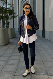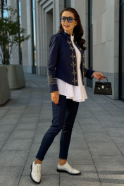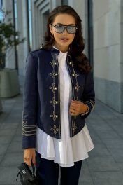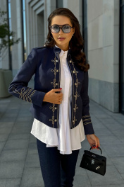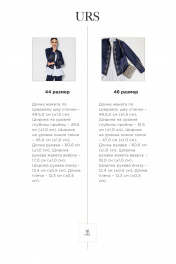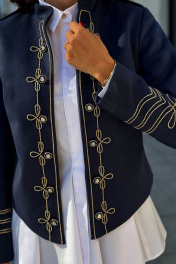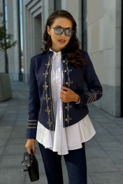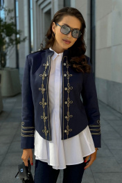 Замшевый жакет в стиле милитари с вышивкой - это оригинальный и стильный элемент гардероба, который подчеркнет вашу индивидуальность. Вышивка на жакете добавляет ему уникальности и делает его неповторимым. Этот жакет идеально сочетается с джинсами, брюками, платьями, создавая образ, который будет привлекать внимание окружающих. Жакет женский полуприлегающего силуэта из мягкой искусственной замши на трикотажной основе в гусарском стиле с декоративной вышивкой шнуром и шестью пуговицами, расположенными параллельно вышивке вдоль борта на левой и правой половинке, без застежки, на подкладке, с погонами, закрепленными пуговицей. Перед жакета разрезной, с нагрудными вытачками, выходящими из бокового шва. Спинка с рельефами, выходящими из проймы и средним швом. Линия низа асимметричная, спинка короче переда. По низу центральная часть переда выполнена углом. Рукава втачные двухшовные, длинные, с декоративной вышивкой шнуром в нижней части. Горловина обработана воротником-стойкой. Жакет с плечевыми накладками. Средняя длина жакета по среднему шву спинки - 50,0 см (±3,0 см), средняя длина рукава – 61,0 см (±1,5 см). Тип ткани: костюмно-плательная. Состав изделия: полиэстер - 75%, вискоза - 21%, спандекс - 4% "44:Длина жакета по среднему шву спинки – 49,5 см (±1,5 см), Ширина на уровне глубины проймы – 49,5 см (±1,0 см), Ширина на уровне линии талии – 45,0 см (±1,0 см), Длина рукава – 60,6 см (±1,0 см), Ширина рукава жакета вверху – 17,0 см (±1,0 см), Ширина рукава внизу - 12,4 см (±0,5 см), Длина плеча – 12,3 см (±0,5 см). 46:Длина жакета по среднему шву спинки – 49,5 см (±1,5 см), Ширина на уровне глубины проймы – 51,5 см (±1,0 см), Ширина на уровне линии талии – 47,0 см (±1,0 см), Длина рукава – 60,6 см (±1,0 см), Ширина рукава жакета вверху – 18,0 см (±1,0 см), Ширина рукава внизу - 12,4 см (±0,5 см), Длина плеча – 12,3 см (±0,5 см). 48:Длина жакета по среднему шву спинки – 49,5 см (±1,5 см), Ширина на уровне глубины проймы – 53,5 см (±1,0 см), Ширина на уровне линии талии – 49,0 см (±1,0 см), Длина рукава – 60,6 см (±1,0 см), Ширина рукава жакета вверху – 19,0 см (±1,0 см), Ширина рукава внизу - 12,4 см (±0,5 см), Длина плеча – 12,3 см (±0,5 см). 50:Длина жакета по среднему шву спинки – 49,5 см (±1,5 см), Ширина на уровне глубины проймы – 55,0 см (±1,0 см), Ширина на уровне линии талии – 51,0 см (±1,0 см), Длина рукава – 61,0 см (±1,0 см), Ширина рукава жакета вверху – 19,0 см (±1,0 см), Ширина рукава внизу - 13,5 см (±0,5 см), Длина плеча – 12,5 см (±0,5 см). 52:Длина жакета по среднему шву спинки – 49,5 см (±1,5 см), Ширина на уровне глубины проймы – 57,0 см (±1,0 см), Ширина на уровне линии талии – 53,0 см (±1,0 см), Длина рукава – 61,0 см (±1,0 см), Ширина рукава жакета вверху – 20,0 см (±1,0 см), Ширина рукава внизу - 13,5 см (±0,5 см), Длина плеча – 12,5 см (±0,5 см). 54:Длина жакета по среднему шву спинки – 49,5 см (±1,5 см), Ширина на уровне глубины проймы – 59,0 см (±1,0 см), Ширина на уровне линии талии – 55,0 см (±1,0 см), Длина рукава – 61,0 см (±1,0 см), Ширина рукава жакета вверху – 21,0 см (±1,0 см), Ширина рукава внизу - 13,5 см (±0,5 см), Длина плеча – 12,5 см (±0,5 см). 56:Длина жакета по среднему шву спинки – 52,5 см (±1,5 см), Ширина на уровне глубины проймы – 60,0 см (±1,0 см), Ширина на уровне линии талии – 56,0 см (±1,0 см), Длина рукава – 61,5 см (±1,0 см), Ширина рукава жакета вверху – 21,5 см (±1,0 см), Ширина рукава внизу - 13,5 см (±0,5 см), Длина плеча – 13,0 см (±0,5 см). 58:Длина жакета по среднему шву спинки – 52,5 см (±1,5 см), Ширина на уровне глубины проймы – 62,0 см (±1,0 см), Ширина на уровне линии