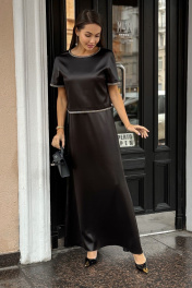 Нарядный женский костюм с платьем от брендов URS — это утончённый праздничный комплект, созданный для тех, кто выбирает изысканность, благородство и проверенную временем классику. Такой вечерний костюм прекрасно вписывается в атмосферу торжества, подчеркивает женственность и обеспечивает комфорт на протяжении всего события. Костюм женский, состоящий из блузона и платья, выполненных из плательной атласной ткани, нарядный. Блузон прямого силуэта, укороченный, с цельнокроеными короткими рукавами, с застежкой по спинке до верха на разъёмную тесьму-молнию с металлическими звеньями. Блузон также можно одевать застежкой на перед. Перед и спинка с цельнокроеным бочком. Рукава цельнокроеные короткие, с притачной нижней частью. Горловина блузона - круглая лодочка, застегивающаяся по спинке на пришивной потайной крючок. Низ переда, спинки и рукавов, горловина, застежка спинки вдоль молнии декорированы отделочной тесьмой из сетки с нашивными бусинами (размер и цвет фурнитуры может незначительно отличаться от фото). Перед, спинка и рукава на подкладке. Платье полуприлегающего силуэта, на бретелях, слегка расклешенное к низу, длинное, на отлетной по низу подкладке. Перед с нагрудными вытачками, выходящими из боковых швов. Верхняя часть переда ˅- образная, углубленная.