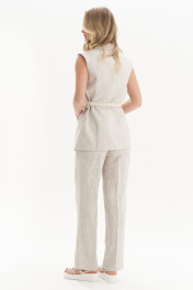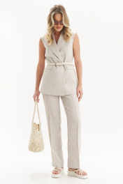 Минимализм, вдохновение природой и идеальный крой — этот костюм из натурального льна создан для тех, кто ценит стиль без усилий. Светло-бежевый оттенок, актуальный силуэт и плетёный пояс на талии делают образ лёгким, утончённым и невероятно летним. Жилет без рукавов с глубоким V-образным вырезом визуально вытягивает силуэт, а прямые брюки дополняют образ элегантностью. Идеален как для отдыха, так и для офиса в тёплое время года. Детали: Натуральный лен — лёгкий и дышащий материал Акцент на талии с поясом из текстильной косы Удлинённый жилет без рукавов Прямые брюки классического кроя Универсальный бежевый оттенок Сочетай с плетёной сумкой, босоножками или сандалиями — и получай образ в стиле eco-luxury. Костюм женский 2-х предметный, состоящий из жилета и брюк, выполненных из костюмно-плательной ткани лен, со съёмным декоративным поясом (размер и цвет фурнитуры может незначительно отличаться от фото), для повседневной носки. Жилет женский, свободного полуприлегающего силуэта, на подкладке, с двубортной застежкой на 2 петли и 2 пуговицы, (размер и цвет фурнитуры может незначительно отличаться от фото). Перед и спинка с отрезным бочком. Перед со смещенными рельефными швами, идущими от пройм до низа, в нижней части с прорезными карманами с клапаном и двумя обтачками, с талиевыми вытачками, идущими от карманов вверх. Спинка со средним швом, с рельефными швами, идущими от пройм до низа. Горловина оформлена воротником пиджачного типа. Проймы обтачные. Брюки женские, классические, с посадкой на талии, на притачном поясе, с 5-ю шлевками, с застежкой на тесьму - «молнию», расположенную в среднем шве передних половинок. Пояс застегивается спереди на 1 пришивной потайной крючок, 1 петлю и 1 потайную пуговицу. Передние половинки брюк с талиевыми вытачками, идущими от пояса вниз и застроченными стрелками с отделочной строчкой 1,5 мм. Задние половинки брюк с двумя парами вытачек, с заутюженными стрелками. В 50,52 размерах по боковым швам в поясе предусмотрены резинки, для лучшего прилегания. 42р Жилет Длина по среднему шву спинки - 72,0 см (±3,0 см), Ширина на уровне глубины проймы - 46,0 см (±1,0 см), Ширина на уровне линии талии - 45,0 см (±1,0 см), Ширина на уровне линии бедер - 53,0 см (±1,0 см), Длина плеча - 14,2 см (±0,5 см). Брюки Длина брюк по боковому шву с поясом - 110,2 см (±3,0 см), Ширина брюк на уровне линии талии - 34,0 см (±1,0 см), Ширина на уровне линии бедер - 45,0 см (±1,0 см), Ширина брюк по низу - 23,5 см (±0,5 см), Ширина пояса - 4,2 см. 44 размер Жилет Длина по среднему шву спинки - 72,0 см (±3,0 см), Ширина на уровне глубины проймы - 46,0 см (±1,0 см), Ширина на уровне линии талии - 45,0 см (±1,0 см), Ширина на уровне линии бедер - 53,0 см (±1,0 см), Длина плеча - 14,2 см (±0,5 см). Брюки Длина брюк по боковому шву с поясом - 110,2 см (±3,0 см), Ширина брюк на уровне линии талии - 34,0 см (±1,0 см), Ширина на уровне линии бедер - 45,0 см (±1,0 см), Ширина брюк по низу - 23,5 см (±0,5 см), Ширина пояса - 4,2 см. 46 размер Жилет Длина по среднему шву спинки - 72,0 см (±3,0 см), Ширина на уровне глубины проймы - 49,0 см (±1,0 см), Ширина на уровне линии талии - 48,0 см (±1,0 см), Ширина на уровне линии бедер - 57,0 см (±1,0 см), Длина плеча - 14,5 см (±0,5 см). Брюки Длина брюк по боковому шву с поясом - 111,2 см (±3,0 см), Ширина брюк на уровне линии талии - 38,0 см (±1,0 см), Ширина на уровне линии бедер - 51,0 см (±1,0 см), Ширина брюк по низу - 25,0 см (±0,5 см), Ширина пояса - 4,2 см. 48 размер Жилет Длина по среднему шв
