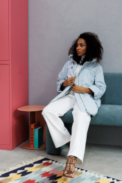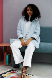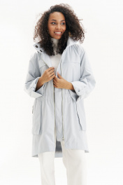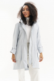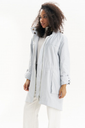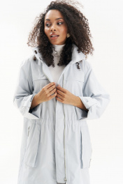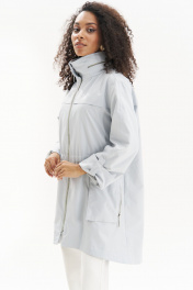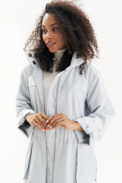 Эта легкая куртка – идеальный баланс между стилем и комфортом. Выполненная в универсальном светлом оттенке, она придает образу свежесть и элегантность, а свободный силуэт с утяжкой на талии подчеркивает фигуру, создавая женственный силуэт. Эта куртка станет стильной основой для любого весенне-осеннего гардероба! Куртка женская прямого силуэта, из плащевой ткани, на подкладке, с центральной бортовой застежкой на металлическую тесьму - «молнию» (размер и цвет фурнитуры может незначительно отличаться от фото), для повседневной носки. Перед с настрочной с изнанки кулисой с резинкой на уровне талии. На нижней части переда настрочены накладные объёмные карманы, застегивающиеся на металлическую тесьму - «молнию». На верхней части переда и спинки обработаны отлетные горизонтальные отлетные планки шириной 4,0 см. Левая часть переда с внутренней ветрозащитной планкой. Рукава втачные, двухшовные, длинные. Верхний шов рукава с пришивной кнопкой. Низ рукава может застёгиваться на хлястик с пришивной потайной кнопкой, тем самым укорачивается длина рукава до 7/8. Горловина обработана широким воротником стойкой, со смещённой относительно центра переда застёжкой на 2 потайные пришивные кнопки. Так же на верхнем воротнике обработан карман, застёгивающийся на металлическую тесьму - «молнию», в котором прячется капюшон. Низ куртки обтачной, перед незначительно короче спинки. По низу куртки прострочена отделочная строчка шириной 3,5см. Средние Средняя длина куртки по среднему шву спинки - 92,0 см (±2,0 см); Средняя длина рукава с расстегнутой патой - 58,0 см (±1,5 см); Средняя длина рукава с застегнутой патой - 46,0 см (±1,5 см); Состав ткани - полиэстер - 100% Тип ткани - плащёвая