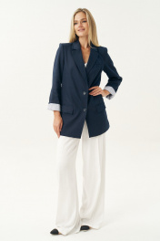 Женский льняной жакет синего цвета — это универсальный элемент гардероба, который легко вписывается в любой стиль: от классического до повседневного. Жакет женский, свободного силуэта, из костюмно-плательной льняной ткани, на подкладке, с центральной бортовой застежкой на 2 петли и пуговицы (размер и цвет фурнитуры может незначительно отличаться от фото), для повседневной носки. Перед в нижней части с прорезными карманами с клапанами и двумя обтачками, с вытачками, от горловины вниз. Левая верхняя часть переда с имитацией прорезного кармана с листочкой с втачными концами. Спинка со средним швом. Рукава втачные, двухшовные, длинные. В локтевом шве по низу с отлетной шлицей с 3-мя петлями и пуговицами. Нижняя часть подкладки рукава выполнена из контрастной по цвету в полоску подкладки, что дает возможность завернуть рукав наверх на манжету. Горловина оформлена воротником пиджачного типа. Жакет с плечевыми накладками. Средняя длина жакета по среднему шву спинки - 79,0 см (±2,0 см); Средняя длина рукава - 63,0 см (±1,5 см); Средняя длина рукава завернутого на манжету 55,0 см (±1,5 см); Жакет с плечевыми накладками. Состав изделия: Х/б - 77%, лен - 20%, спандекс - 3%. Состав подкладки: хлопок - 100%. 46 размер Длина по среднему шву спинки - 80,0 см (±2,0 см), Ширина на уровне глубины проймы - 54,0 см (±1,0 см), Ширина на уровне линии талии - 58,0 см (±1,0 см), Ширина на уровне линии бедер - 65,0 см (±1,0 см), Длина рукава - 63,0 см (±1,0 см), Ширина рукава вверху - 18,0 см (±1,0 см), Ширина рукава по низу - 16,0 см (±0,5 см), Длина плеча - 13,5 см (±0,5 см). 48 размер Длина по среднему шву спинки - 80,0 см (±2,0 см), Ширина на уровне глубины проймы - 56,0 см (±1,0 см), Ширина на уровне линии талии - 60,0 см (±1,0 см), Ширина на уровне линии бедер - 67,0 см (±1,0 см), Длина рукава - 63,0 см (±1,0 см), Ширина рукава вверху - 19,0 см (±1,0 см), Ширина рукава по низу - 16,0 см (±0,5 см), Длина плеча - 13,5 см (±0,5 см). 50 размер Длина по среднему шву спинки - 80,0 см (±2,0 см), Ширина на уровне глубины проймы - 58,0 см (±1,0 см), Ширина на уровне линии талии - 62,0 см (±1,0 см), Ширина на уровне линии бедер - 69,0 см (±1,0 см), Длина рукава - 63,0 см (±1,0 см), Ширина рукава вверху - 20,0 см (±1,0 см), Ширина рукава по низу - 16,0 см (±0,5 см), Длина плеча - 13,5 см (±0,5 см). 52 размер Длина по среднему шву спинки - 82,0 см (±2,0 см), Ширина на уровне глубины проймы - 61,0 см (±1,0 см), Ширина на уровне линии талии - 65,5 см (±1,0 см), Ширина на уровне линии бедер - 70,5 см (±1,0 см), Длина рукава - 63,0 см (±1,0 см), Ширина рукава вверху - 20,5 см (±1,0 см), Ширина рукава по низу - 17,0 см (±0,5 см), Длина плеча - 13,7 см (±0,5 см). 54 размер Длина по среднему шву спинки - 82,0 см (±2,0 см), Ширина на уровне глубины проймы - 63,0 см (±1,0 см), Ширина на уровне линии талии - 66,5 см (±1,0 см), Ширина на уровне линии бедер - 72,5 см (±1,0 см), Длина рукава - 63,0 см (±1,0 см), Ширина рукава вверху - 21,5 см (±1,0 см), Ширина рукава по низу - 17,0 см (±0,5 см), Длина плеча - 13,7 см (±0,5 см). 56 размер Длина по среднему шву спинки - 82,0 см (±2,0 см), Ширина на уровне глубины проймы - 65,0 см (±1,0 см), Ширина на уровне линии талии - 67,5 см (±1,0 см), Ширина на уровне линии бедер - 74,5 см (±1,0 см), Длина рукава - 63,0 см (±1,0 см), Ширина рукава вверху - 22,5 см (±1,0 см), Ширина рукава по низу - 17,0 см (±0,5 см), Длина плеча - 13,7 см (±0,5 см).