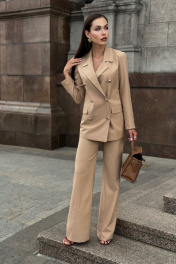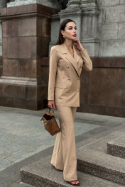 Стильный женский костюм в благородном оттенке Кемел. Костюм состоит из жакета на подкладке, и брюк (палаццо ) высокой посадки, расширенные к низу с поясом на талии, с карманами в боковых швах. Высокая посадка брюк визуально поднимает талию и делает ноги длиннее . Застежка -пуговица, молния. Жакет приталенный, двубортный с карманами листочки, воротник классический пиджачный ,рукав вточной, двухшовный. Итальянская фурнитура (металл )