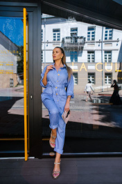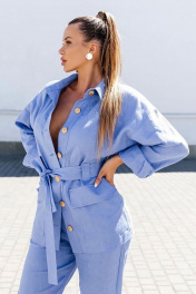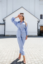 Комплект двухпредметный: жакет, брюки. Комплект выполнен из натурального льна. Жакет выполнен в виде рубашки свободного кроя с накладными карманами и съемным поясом, застежка на бамбуковые пуговицы. Брюки, оформлены притачным поясом, сзади по талии - резинка.