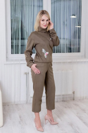 Комплект состоящий из бомбера и брюк. Брюки высокие, на уровне талии пояс, застежка центральная на молнию и брючные крючки. Брюки прямые длинной 7/8. Бомбер объёмный, со спущенной линией плеча, длиной до талии, по горловине воротник хомут, в низ рукавов и низ изделия вставлены резинки. Перед бомбера с дизайнерской вышивкой.(Нитки производство Германия, не окрашиваются).