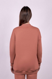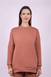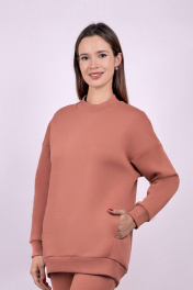 Джемпер женский из футера с начесом. Горловина круглая, обработана кашкорсе. Боковой шев смещен на перед, в боковом шве расположены карманы. Спущенный рукав.