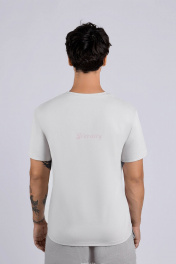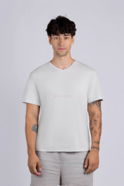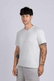 Фуфайка мужская, свободного силуэта из хлопкаа с лайкрой. Полотно имеет бархатистую поверхности с "пич-эффектом". Рукав втачной короткий, горловина V-образной формы, обработана бейкой из основного полотна.
