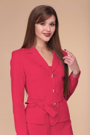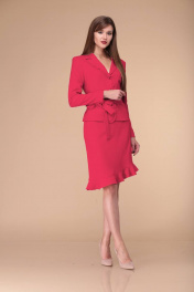 Жакет на подкладке с плечевыми накладками. Жакет с лацканами, по правому лацкану и борту декоративная отделка из шифона в виде рюши. Жакет под пояс, застёжка – петли-пуговицы. Рукав длинный. Юбка облегающая на подкладке. Низ юбки косой с воланом. Юбка на поясе, застёжка по среднему шву спинки на потайную молнию и пуговицу. Длина рукава -61 см, длина изделия по боковому шву юбки 63 см, длина по среднему шву спинки 52 см.
