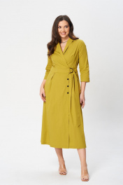 Платье женское А-образного силуэта. С поясом на полукольцо. По переду запах с застежкой на петли пуговицы. Карманы в боковых швах, по переду и спинке складки. Рукав 3/4, с разрезами. Воротник “апаш”.