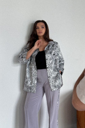 Комплект двойка состоят из жакета и брюк. Жакет свободного кроя.Рукав втачной ¾ ,с патой. Воротник рубашечного типа. По переду декоративные клапаны с пуговицей. Брюки прямого кроя со вставками в боковых швах. Средняя посадка, пояс на резинке. Карманы в боковых швах.