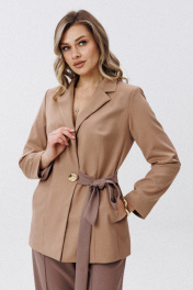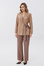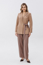 Комплект женский, двойка. Состоящий из жакета и брюк. Жакет прямого силуэта, на подкладке. Воротник пиджачного типа. По рельефу выполнены функциональные карманы. Втачной длинный рукав. Жакет застегивается на 2 потайные кнопки. Жакет с дизайнерским поясом. Брюки классические, прямого кроя. С карманами в боковых швах. По переду настрочной кант. Пояс на резинке.