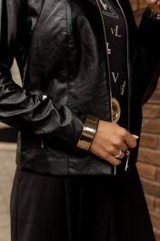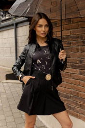 Куртка прилегающего силуэта, выполнена из "эко" кожи спереди и трикотажного полотна по спинке (спереди на подкладке). Спереди застёжка на отделочную тесьму тесьму-молнию. карманы с застёжкой на отделочную тесьму-молнию. По горловине стойка с застёжкой на кнопку. Рукав втачной, по низу пришивной браслет с логотипом VL.  Длина изделия - 54 см. Длина рукава - 59 см.