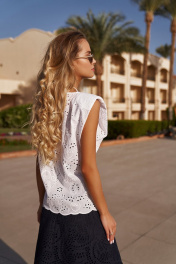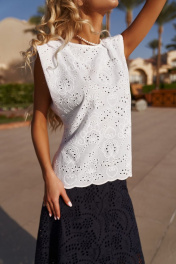 Комплект: блузка и юбка. Выполнен из хлопковой ткани "шитье". Блузка прямого силуэта. Горловина круглая, обработана окантовкой. Изделие без рукавов. Плечо расширено и с плечевой накладкой.Юбка А-силуэта. По верху с притачным поясом высотой 4 см. На переде юбки настрочные карманы фигурной формы.
