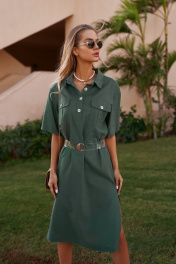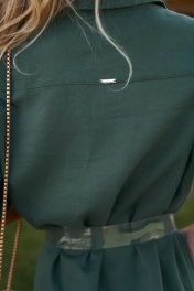 Платье прямого силуэта из льняной ткани, с центральной  застёжкой на петли пуговицы на планке. По переду нагрудная вытачка и накладной карман с  клапаном. На спинке двойная кокетка, а в боковых швах  внутренние карманы. Воротник стояче отложной, с отрезной стойкой. Рукав одношовный на спущенном плече. По боковым швам разрезы. В комплекте идет съемный пояс. На спинке декоративный элемент - пришивной логотип Vesnaletto.