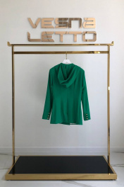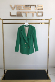 Жакет прилегающего силуэта, с капюшоном. Выполнен из костюмной ткани, на подкладке. Спереди двубортная застёжка, прорезные карманы. Рукав втачной. Длина рукава - 61 см. Длина жакета 72 см. Длина рукава 61 см. Измерения по готовому изделию 44 р-р: ОГ- 94 см., ОТ - 82 см. 46 р-р: ОГ- 98 см., ОТ - 86 см. 48 р-р: ОГ- 102 см., ОТ - 90 см.