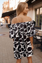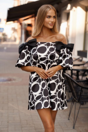 Платье силуэта трапеция, короткое, расширено к низу. Изделие выполнено из плательной ткани, верхняя часть из прозрачного трикотажного полотна сетка.Горловина круглая, по спинке застежка в среднем шве спинки на потайную молнию и пришивной крючок.Рукав втачной, короткий, объемной формы со складками.Спинка расширена, со складками.На передней части рукавов закреплены декоративные банты. Изделие на подкладке. Длина рукава - 34 см.