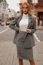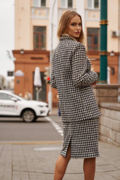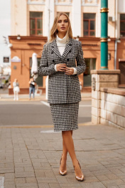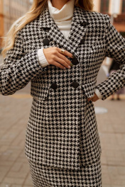 Жакет полуприлегающего силуэта. Застежка двубортная на петли и пуговицы.Воротник отложной с лацканом. Рукав втачной, двухшовный, длинный.Жакет с отрезными бочками и рельефами по переду. На переде прорезные карманы с листочкой и клапаном.Длина жакета ниже линии бедер.Изделие на подкладке. Длина рукава - 61 см.